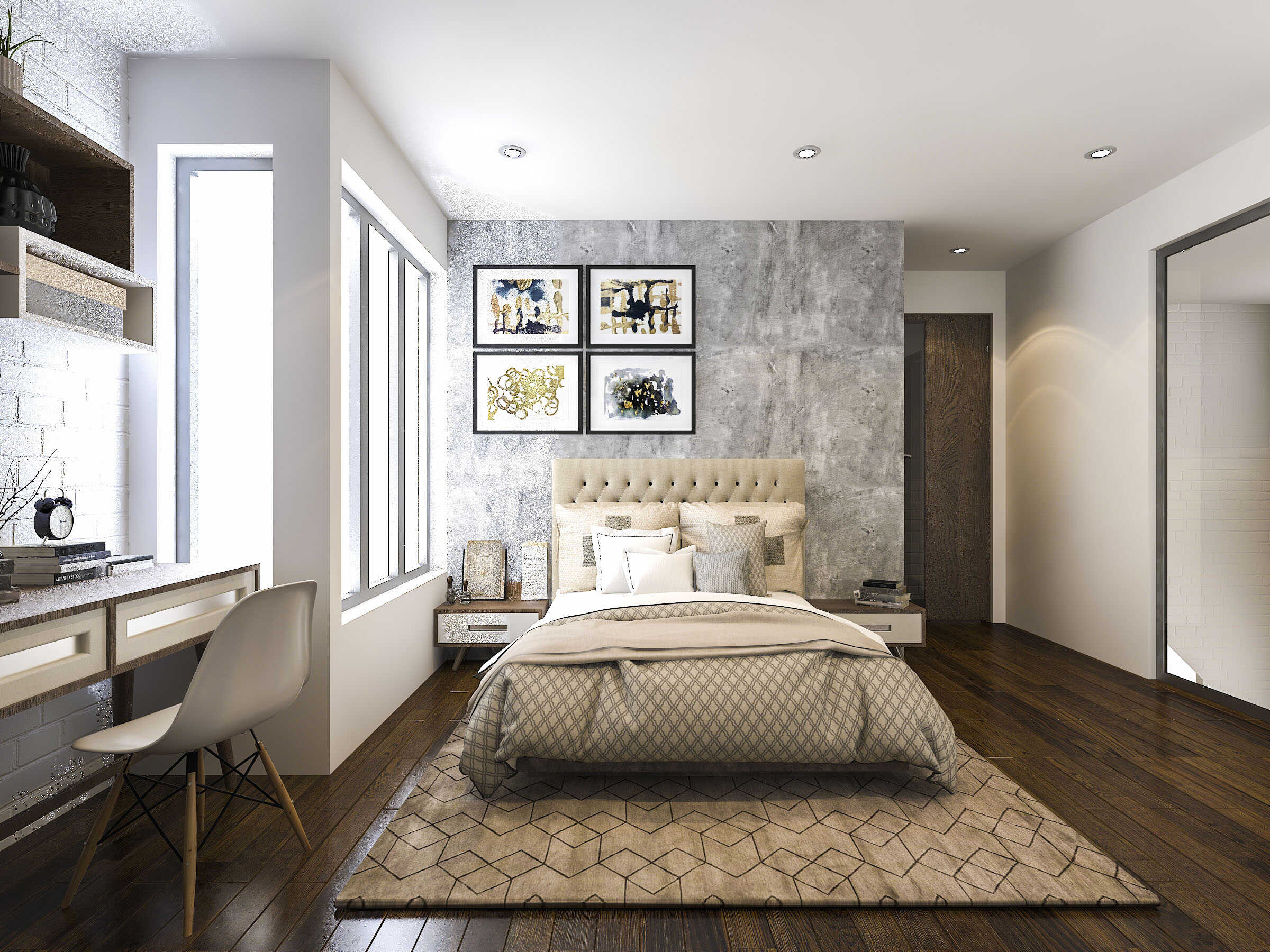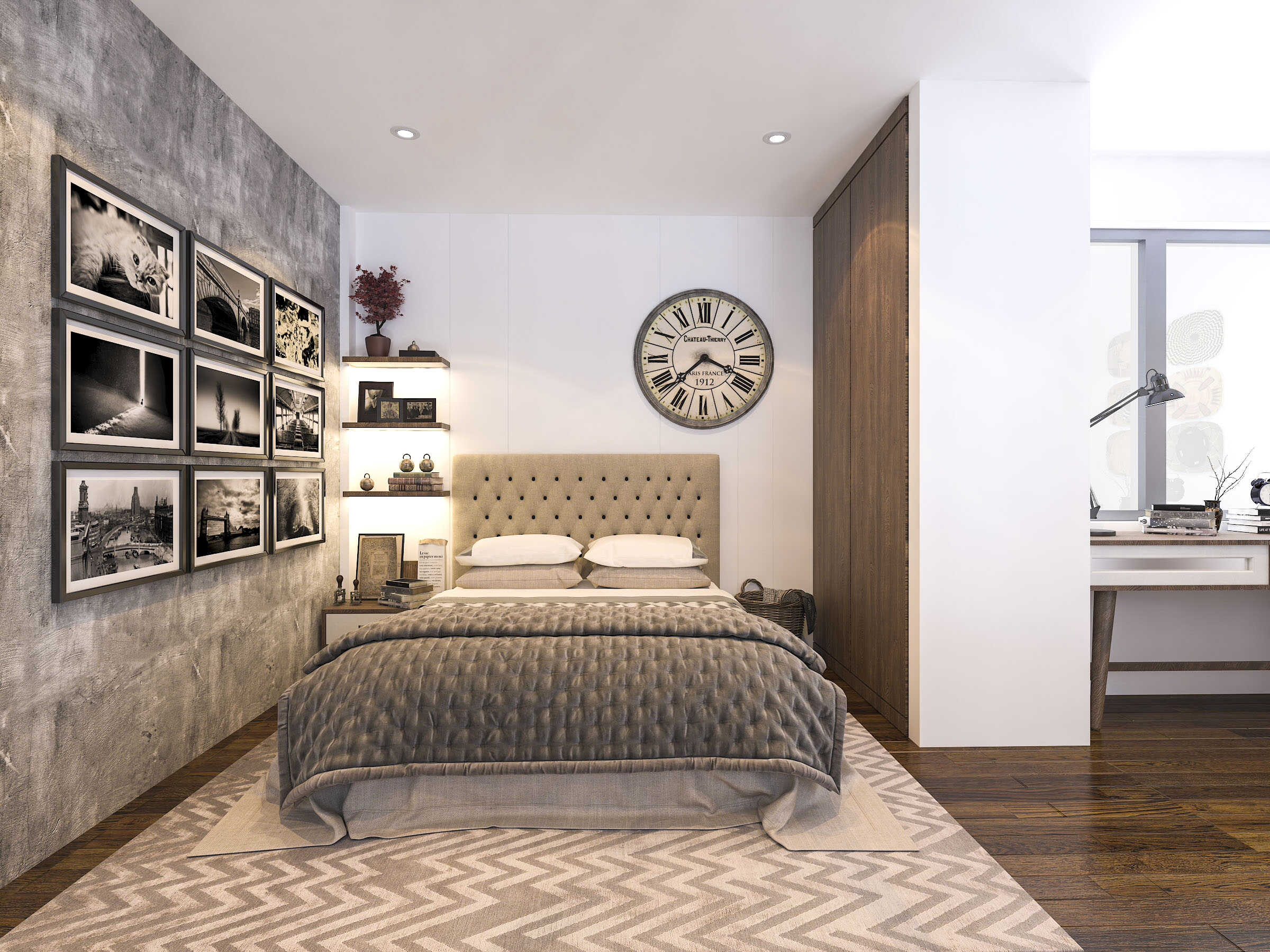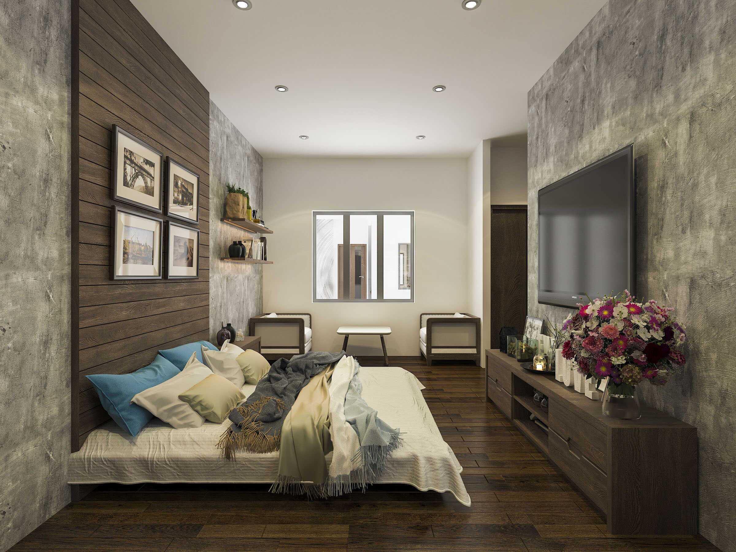 Sự phối hợp màu sắc khéo léo giữa gam trắng kem, tone trầm của gỗ và các gam màu xám tạo ra một tầm nhìn có chiều sâu và cảm giác thoải mái, sang trọng cho không gian khách sạn.