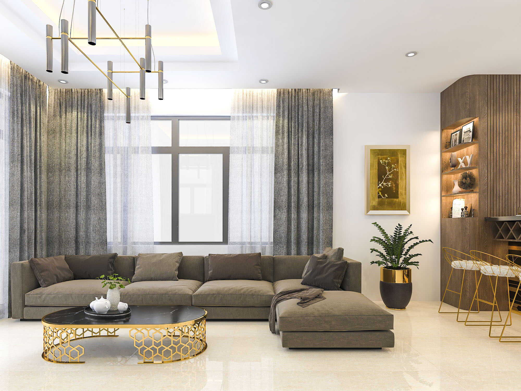Lối thiết kế nội thất chú trọng vào sự tương phản, với sự kết hợp tinh tế giữa gam màu trung tính và những điểm nhấn hoàng gia. Bố trí nội thất được thực hiện một cách tinh tế, từ bộ sofa lớn thoải mái, bàn trà được chọn lựa kỹ càng đến các tác phẩm nghệ thuật trang trí tường, tạo nên không gian sống độc đáo và đẳng cấp