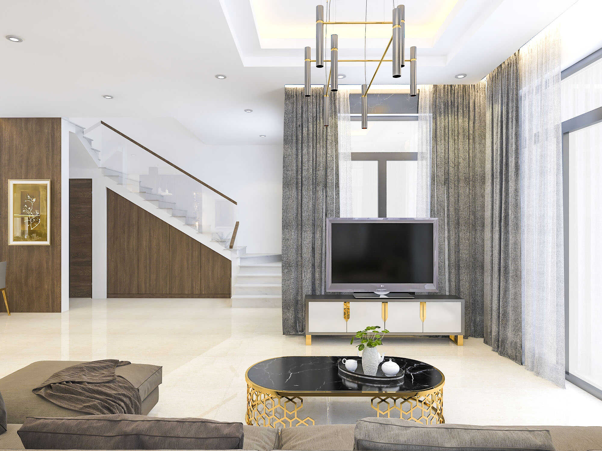 Không gian phòng khách tại Dự án Nhà phố Park Riverside được thiết kế như một bức tranh tinh tế kết hợp sự hiện đại và sự ấm áp của ngôi nhà. Với diện tích sàn rộng lớn, phòng khách trở thành một không gian thoải mái, mở rộng, mang đến cảm giác rộng lớn và thoải mái cho gia chủ và khách ghé đến