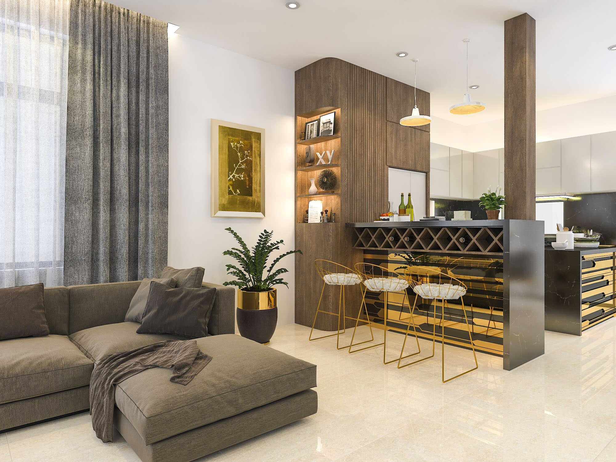 Quầy Bar được thiết kế với màu sắc và vật liệu trang trí tinh tế, tạo nên sự tương phản. Ánh sáng mềm mại từ đèn trang trí kết hợp với ánh sáng tự nhiên mang đến cảm giác thoải mái và thư giãn