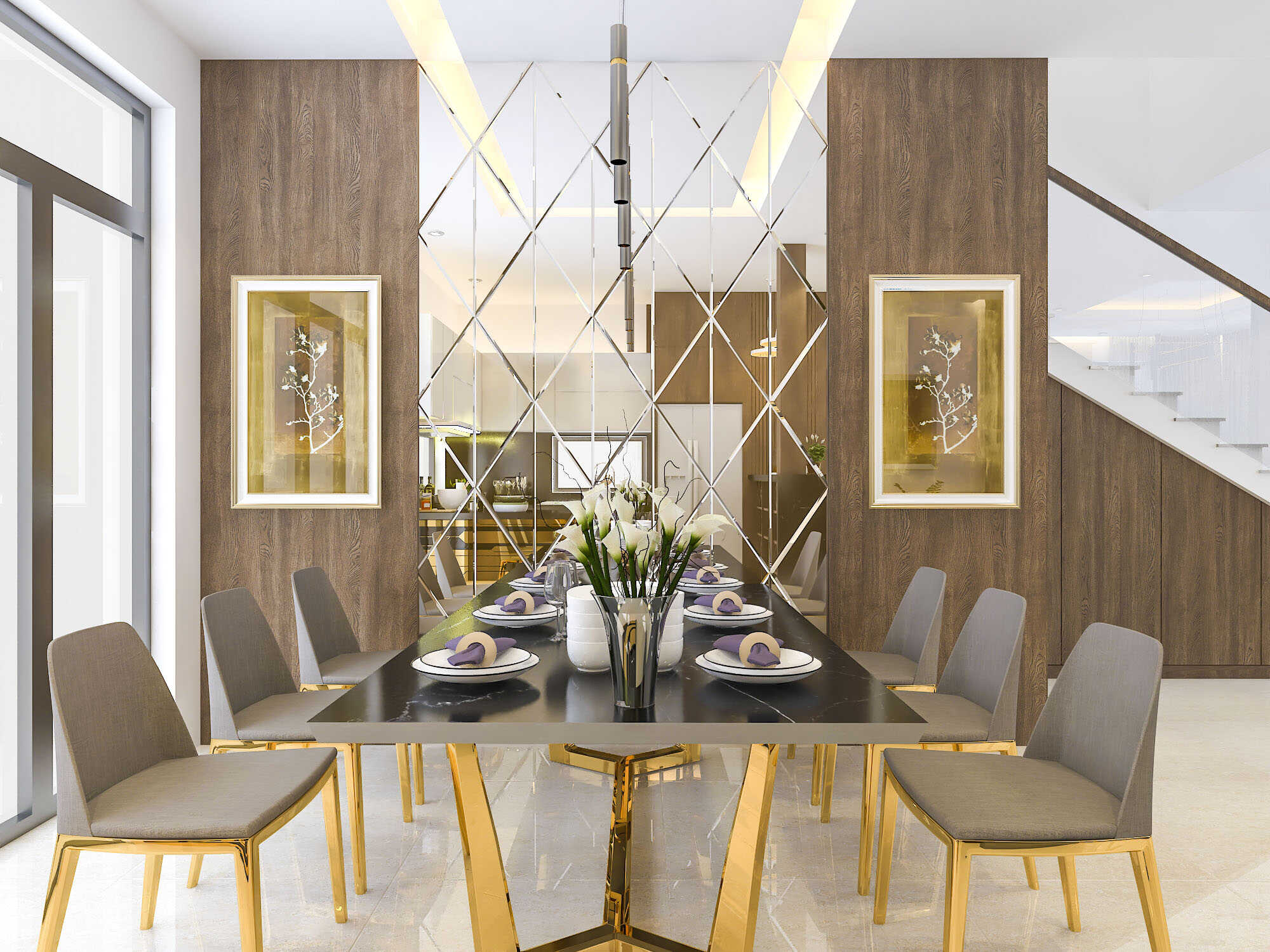 Không gian bếp được thiết kế với màu sắc hài hòa giữa gam màu trung tính và các chi tiết trang trí tinh tế. Các tấm gương và bề mặt bếp bằng tạo ra hiệu ứng ánh sáng đa chiều, tạo điểm nhấn độc đáo và khiến không gian trở nên rộng rãi hơn.
